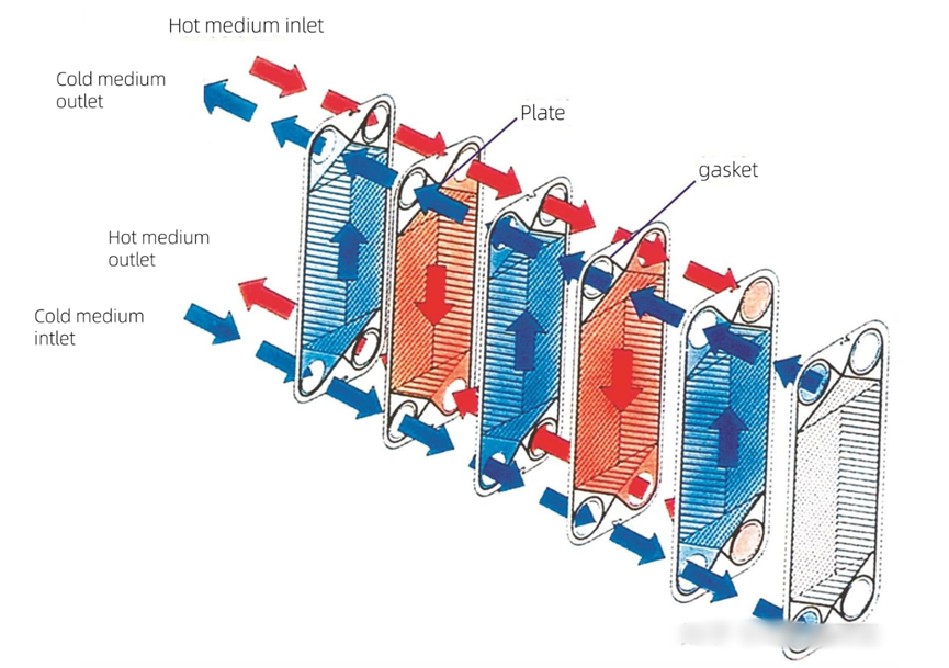 Fluid flow: In plate heat exchangers, two fluids flow through different channels and do not mix with each other. High temperature fluids release heat during flow, while low temperature fluids absorb this heat, thus achieving heat transfer.